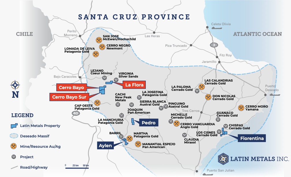 Figure 1: Location of the Cerro Bayo, Cerro Bayo Sur, and La Flora properties, together with Latin Metals’ additional property interests in Santa Cruz.