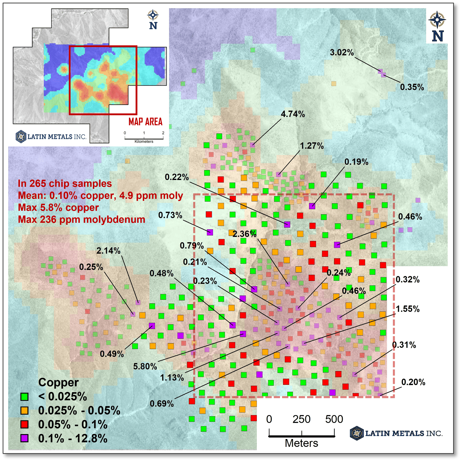Vancouver, B.C. – Latin Metals Inc. (“Latin Metals” or the “Company”) - (TSXV: LMS and OTCQB: LMSQF) announces the results of its surface rock sampling program at the 100%-own Auquis Project (the “Project”), located in Peru. A total of 200 additional rock samples were collected, returning anomalous mineralization grading up to 5.8% copper and 236ppm molybdenum. A total of 434 rock samples have now been collected across the Project area, defining a core area of high-grade mineralization that measures 1.5km by 1.5km.