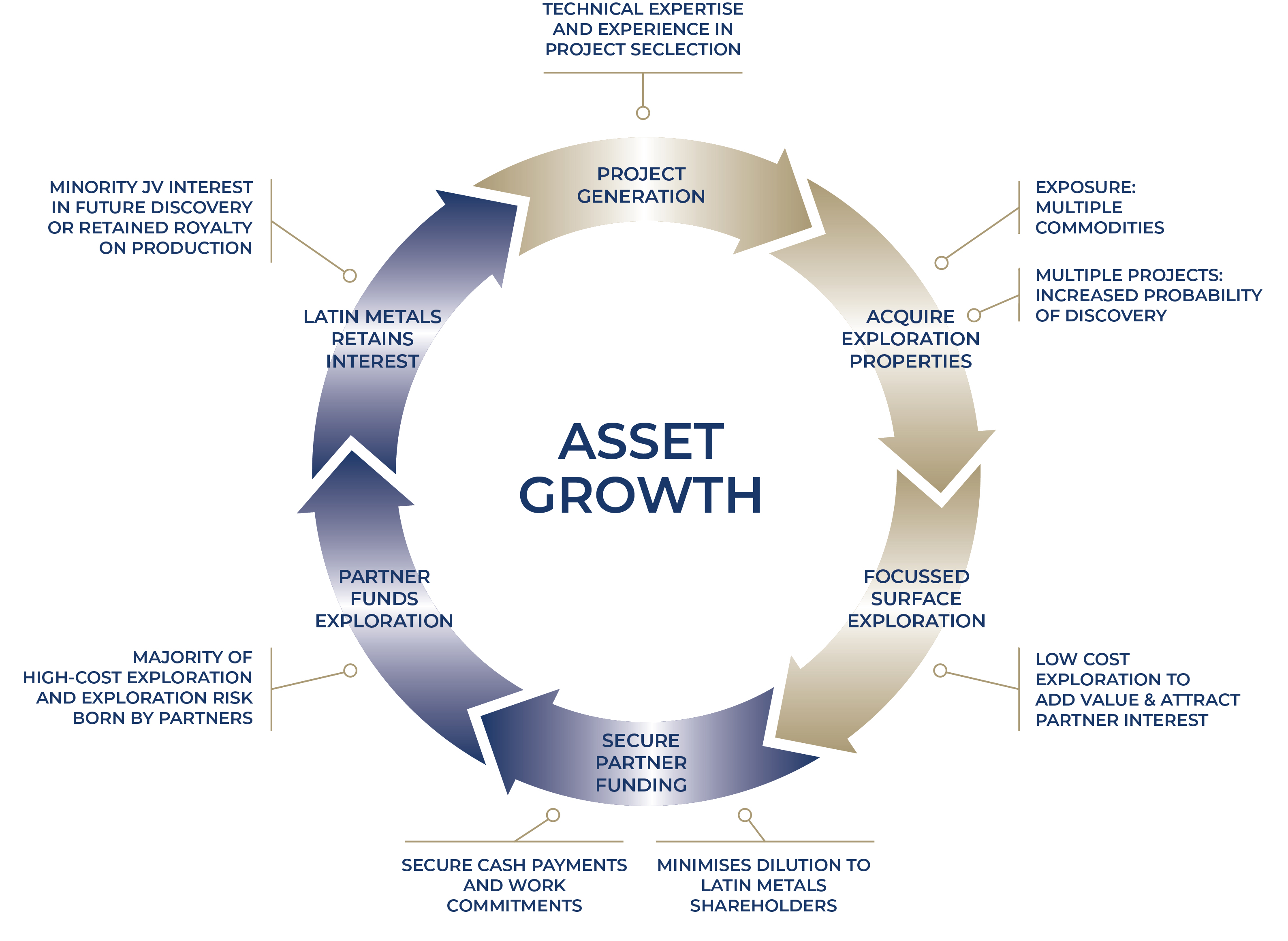At its core, the prospect generator model is a shareholder-focused model which aims to protect investors from excessive dilution associated with frequent equity financings (Figure 1). The model ultimately works to increase the chances of exploration success by having multiple exploration projects funded by option partners. In each case Latin Metals retains a minority interest in the projects and attempts to avoid shareholder dilution by keeping costs low.