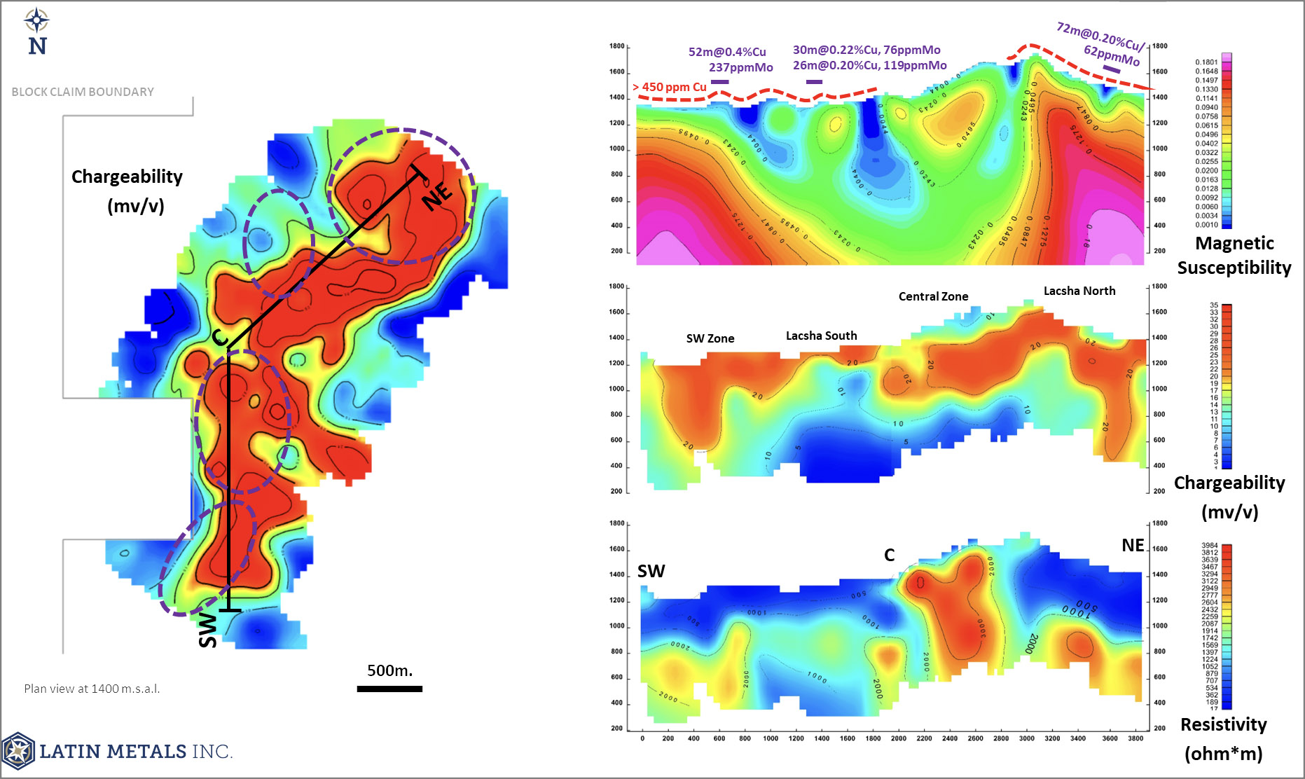 “The recently received IP data is the final layer of data that we will use to define drill targets. Combined with magnetic data and surface geochemistry, we see a relatively simple suite of anomalies that define four significant drill targets,” stated Keith Henderson, Latin Metals’ President & CEO. “Surface chip channel sampling completed in Q1 defined consistent mineralization including 52m grading 0.38% copper and 237ppm molybdenum. While these grades are excellent, the IP chargeability data points to peak chargeability below surface at approximately 100m from surface. The project will need to be drilled to establish whether chargeability is related to copper mineralization.”