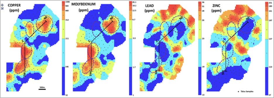 Figure 2: Talus copper, molybdenum, zinc, and lead geochemistry at Lacsha, showing patterns typically seen in certain porphyry deposits; anomalous copper and molybdenum high and lead-zinc low. Four targets are highlighted as circular dashed lines. Interpretation of Exploration Results