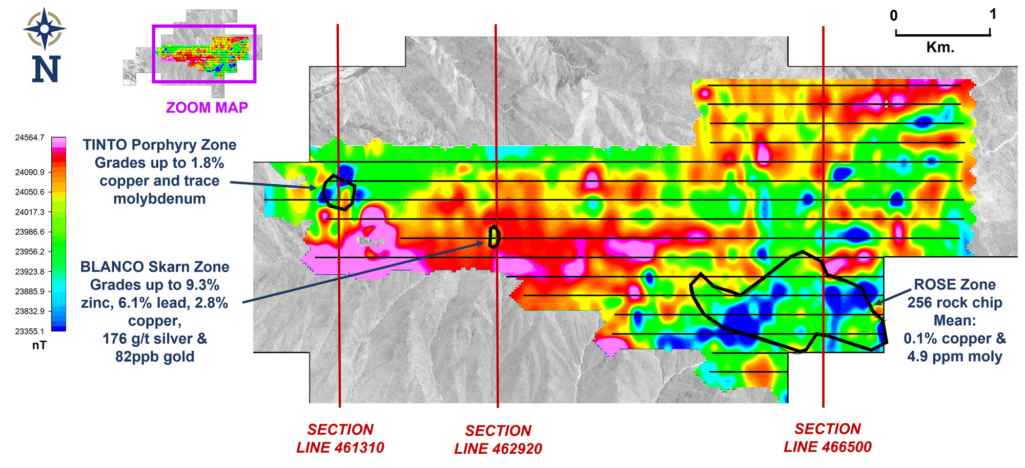 Blanco Zone – a large and intense magnetic anomaly appears to coincide with the skarn alteration zone mapped at surface in limestones, where a grab sample returned 1.4% lead, 0.7% zinc, 0.08% copper, and 17 ppb gold. The anomaly is interpreted to represent a potentially large skarn system at depth.