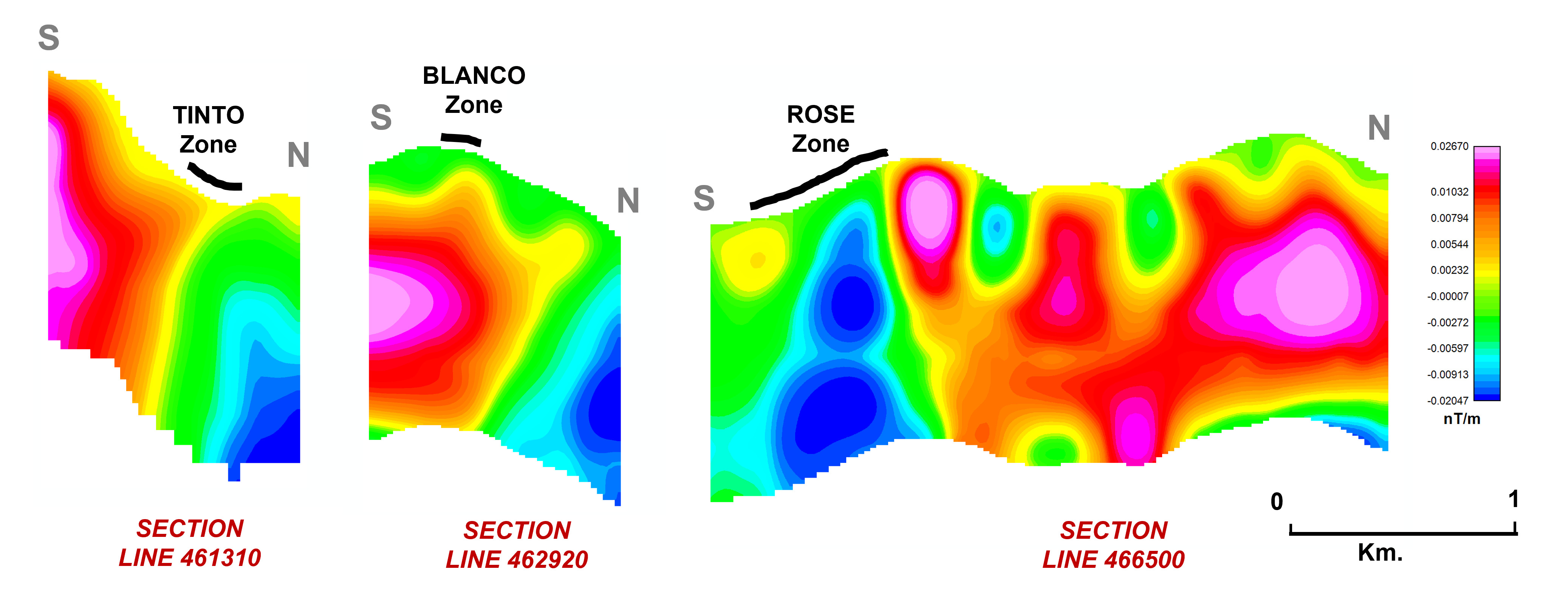 Figure.2: Cross sections through inverted 3D model data on section lines 461310, 462920 and 466500 showing magnetic anomalies underlying known mineralization at the Tinto, Blanco, and Rose zones.