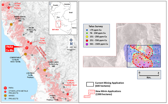Figure 1. Location of Para Copper Project (left) and results of talus sampling survey, showing two primary anomalous zones highlighted with red dashed line. Newly staked claims are shown also.