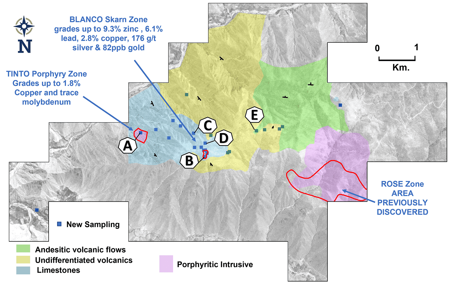 Sampling at the Blanco Zone returned values of up to 9.3% zinc, 6.1% lead, 2.8% copper, 176 g/t silver and 82 ppb gold. The skarn alteration does not appear to be related to either the Tinto Zone to the west, or the previously identified porphyry mineralization at the Rose Zone to the east, where sampling outlined a large area of copper and molybdenum mineralization measuring 1.5 km x 1.5 km (see news release November 3, 2022). The skarn mineralization at the Blanco Zone is tentatively interpreted as being related to an intrusive at depth.