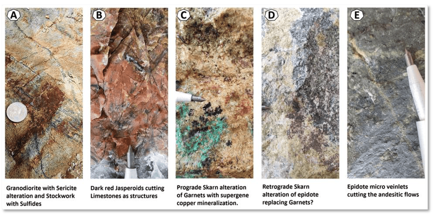 Figure 2. Samples showing porphyry and skarn type mineralization in the new Tinto and Blanco Zones