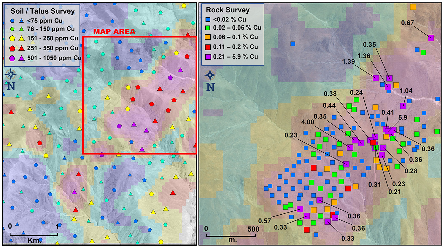 Figure 1: Results of previous soil / talus sampling (left) and rock chip sampling results(right) at the Tillo project, Peru.