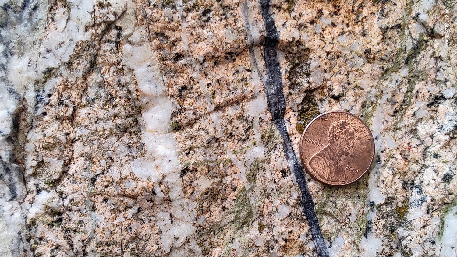 Figure 2: Quartz monzonite porphyry with potassic alteration and multiple quartz veinlets (B veins) cutting earlier epidote veinlets, and all cross cut by later specularite-quartz veinlet.