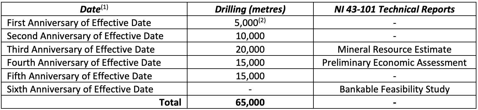 - complete at least in the aggregate amount of 65,000 metres of drilling on the Projects (Table 2), and