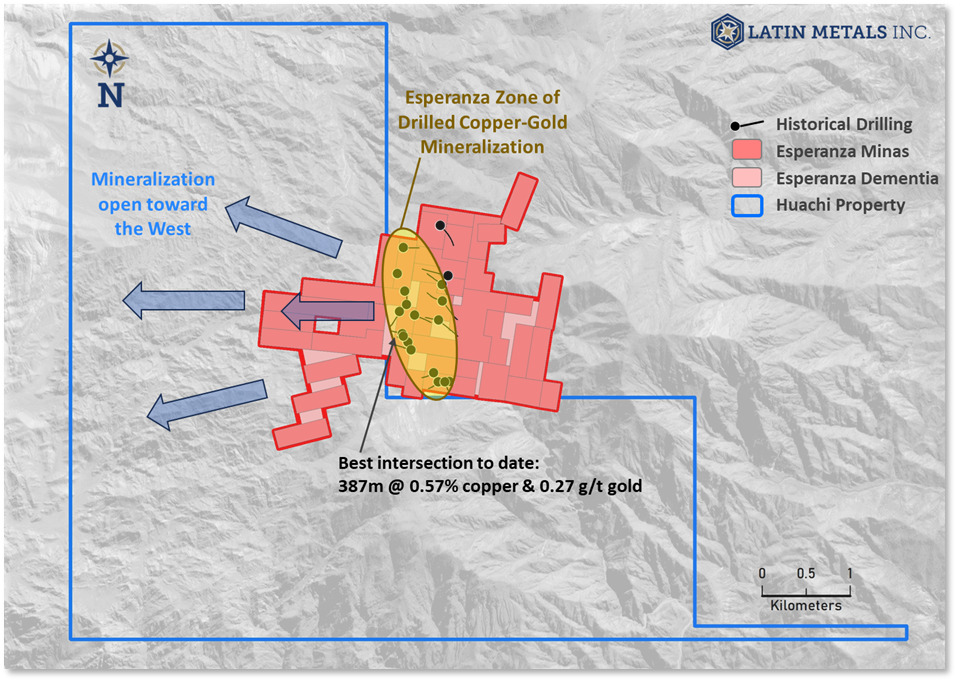 Esperanza is a copper-gold porphyry exploration project where a copper-gold porphyry system has been partially defined by drilling and where a pyrite halo is exposed at surface over an area of 1,400m x 850m. Drill hole 18-ESP-025 (see news release May 8, 2018), completed by Latin Metals, returned 387m grading 0.57% copper and 0.27 g/t gold from surface, including 166m grading 0.84% copper and 0.37 g/t gold from surface (true width unknown). Mineralization is open in all directions with an interpreted vector to the west towards the Huachi property. Latin Metals has an option to acquire 100% interest in the Esperanza Property.