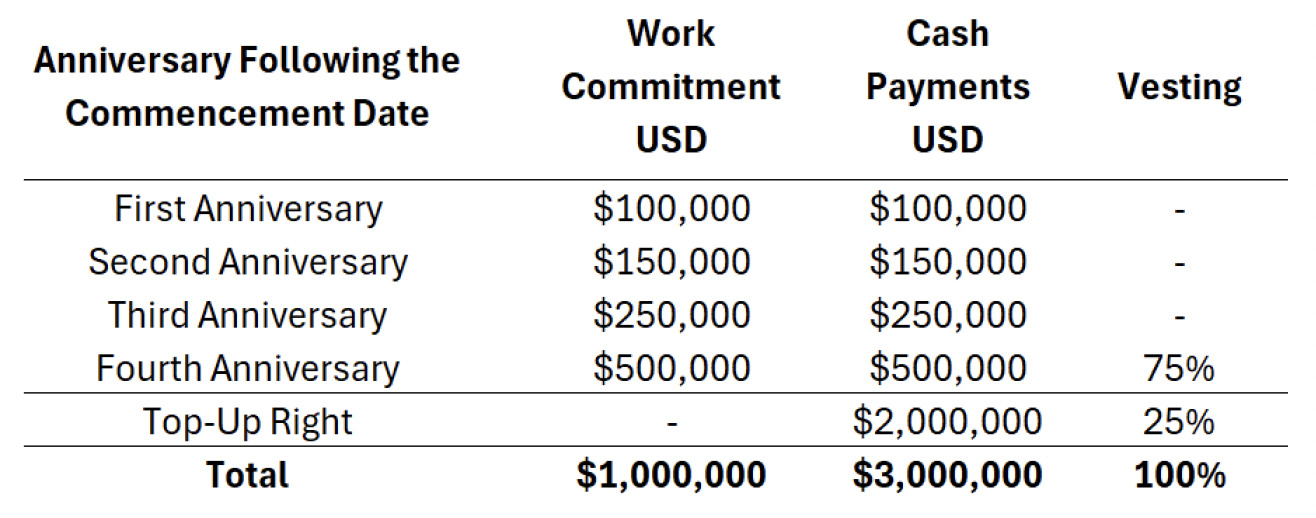 Note. The four-year Option Period commences on the Commencement Date, which is the date on which the environmental permit (Declaración de Impacto Ambiental or DIA) is approved and in force, allowing exploration activities to begin. If the DIA is not obtained on or before February 28, 2027, then the Definitive Agreement will be terminated.