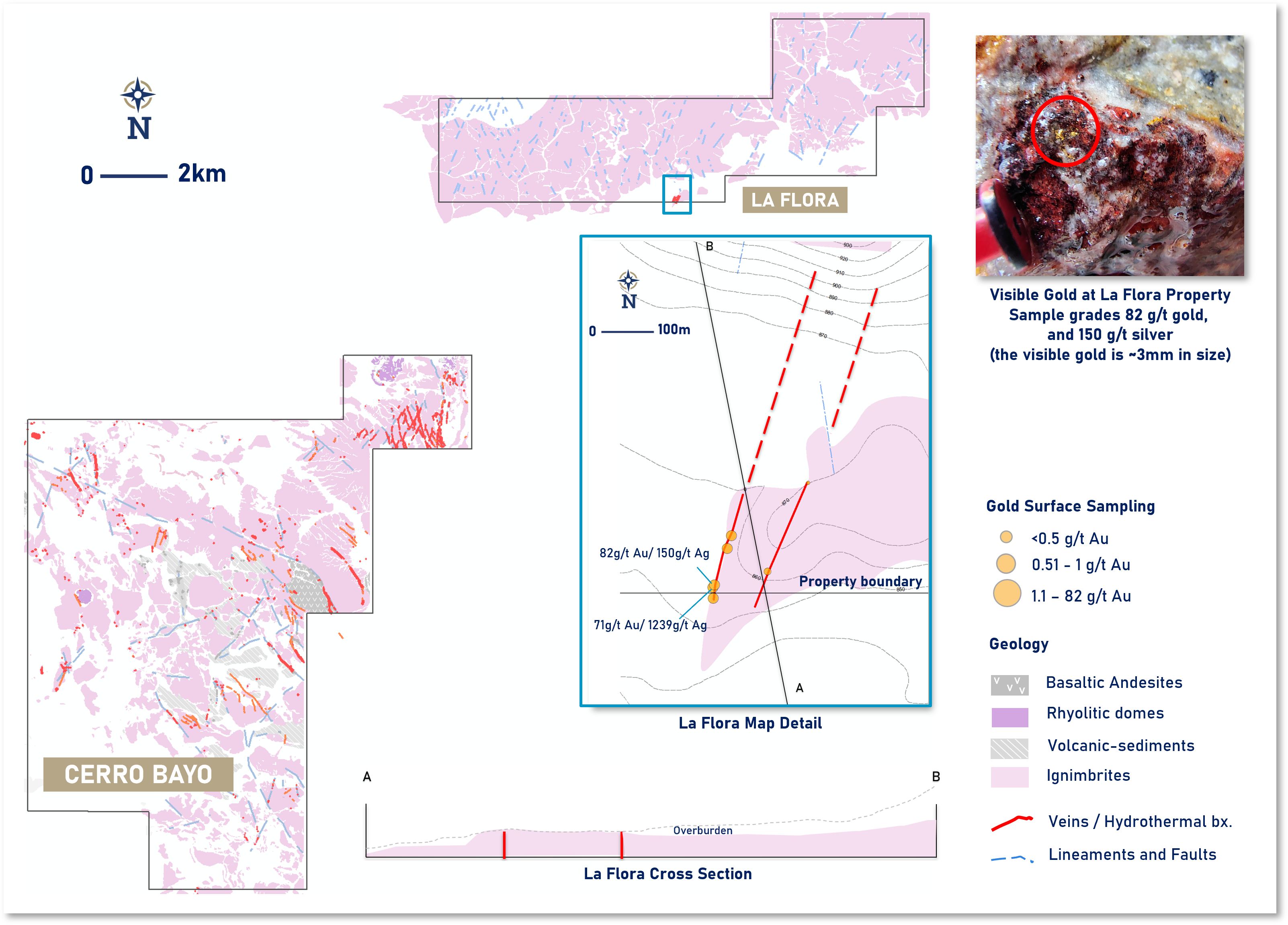 Samples were collected from two outcropping structures where visible gold was observed as part of a grey, microgranular silica event within the La Flora project area. Assay results from these samples returned values of up to 82 g/t gold and 1,239 g/t silver. To the north, these structures are concealed beneath overburden material and further testing of these bonanza-grade veins will need to be undertaken as part of future drilling.
