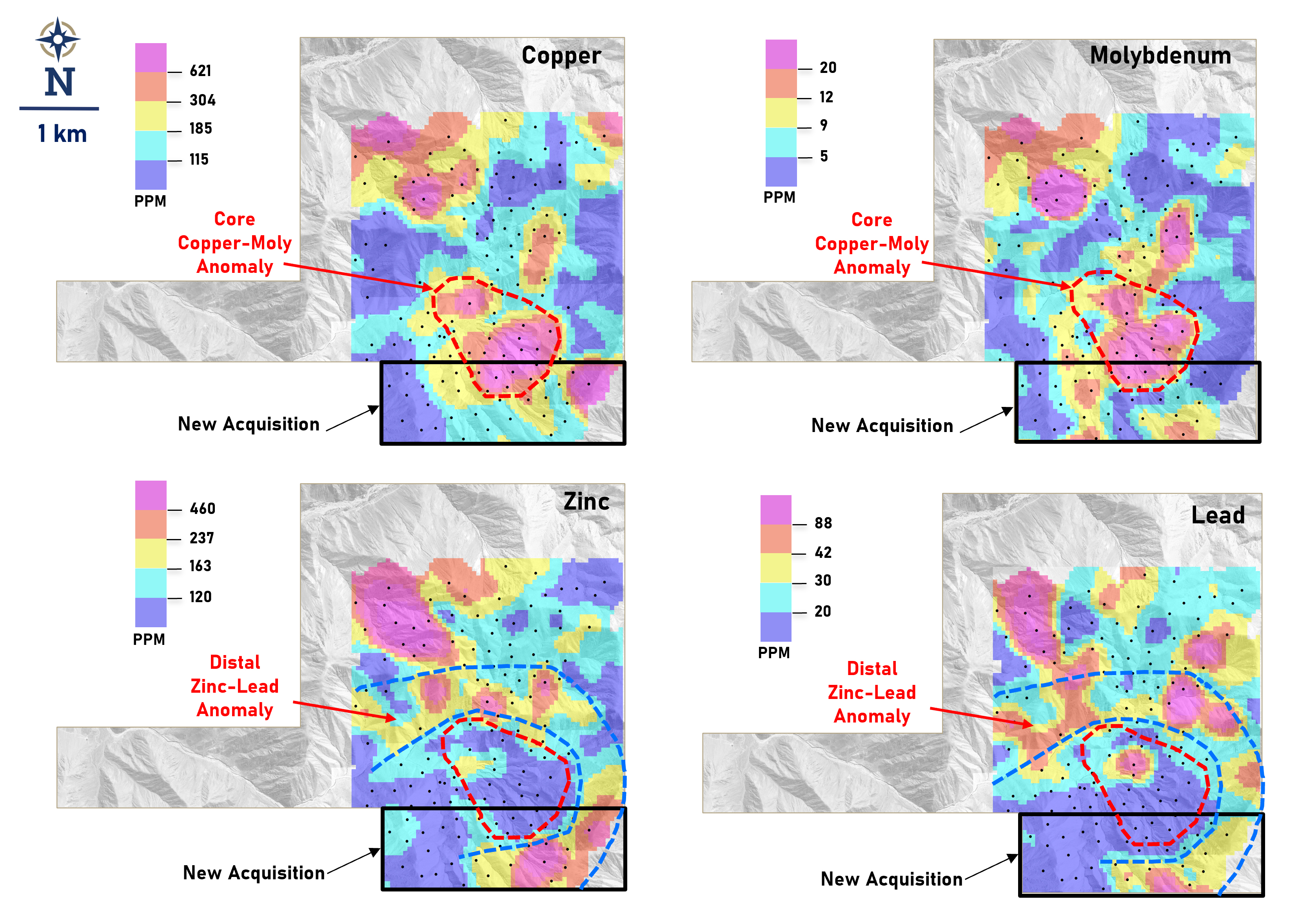 Figure 1: Results of Latin Metals' geochemical talus sampling survey showing favorable chemical zonation interpreted as centering on a porphyry system. Proximal and coincident copper and molybdenum anomalies are interpreted to overlie a porphyry system, and coincident zinc and lead anomalies are distal, surrounding the core copper-molybdenum anomalies. This pattern is typical of porphyry systems. New property acquisition shown.